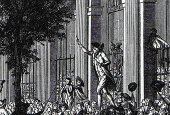 Camille Desmoulins, sortant du café de Foy établi sous les galeries, saute sur une chaise et, tenant d’une main une épée nue, de l’autre un pistolet, crie : « Aux armes ! » Puis il jette des mots hachés : « J’arrive de Versailles, Necker est chassé ; c’est le tocsin d’une Saint-Barthélemy de patriotes. Ce soir même tous les bataillons suisses et allemands sortiront du Champ-de-Mars pour nous égorger. Une ressource nous reste, c’est de courir aux armes ! » Des voix hurlent : « Aux armes ! » Quelqu’un arrache une feuille de marronnier et la glisse dans la ganse de son chapeau : « Il nous faut une cocarde pour nous reconnaître. Celle-ci a la couleur de l’espérance ! » Tous la prennent, au point que les branches sont dépouillées.