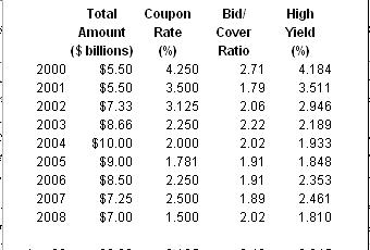 √ Une émission d'obligation indexée sur l'inflation à 10 ans annoncée semaine dernière a été émise aujourd'hui (6 Mds $) avec un résultat toujours favorable comme le montre le tableau ci-dessus. Le taux de couverture est en retrait par rapport à janvier mais toujours assez élevé dans l'absolu et au-delà de la moyenne historique sur 5 ans. Les autres émissions du jour n'appellent pas de commentaires particuliers mis à part pour une échéance à 4 semaines à hauteur de 28 milliards $ qui a vu son taux de couverture passer à 3,41, un niveau très élevé et en hausse par rapport à la moyenne constatée au 1er trimestre sur cette maturité. Voilà qui illustre toujours le besoin de sécurité des investisseurs et donc l'attrait pour le court et très court terme.
