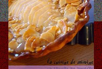 Une crème fondante à la cannelle, quelques lamelles de poires et pour le croustillant : un nappage aux amandes effilées ou plutôt une sorte de caramel d’amandes avec du miel : un régal !