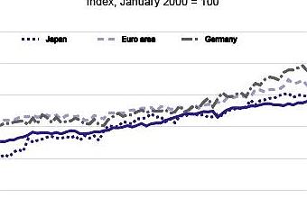 Regardons la première courbe qui représente l'évolution de la production industrielle depuis 2000 ( base 100 en 2000) dans les pays de la zone Euro, l'Allemagne, les USA et le Japon.