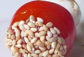 3- Piquez les tomates cerises sur des piques en bois et trempez-les une à une dans le caramel. Déposez dans le sésame et laissez refoirdir sur une assiette. Recommencez avec les autres tomates.