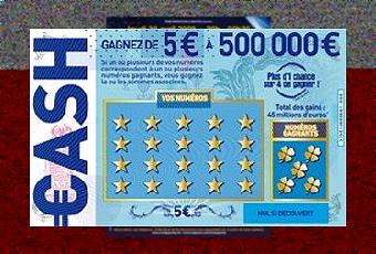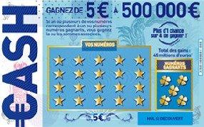 Nouveau jeu à gratter de la Française des Jeux, CASH 500 000 € est vendu 5 euros et vous propose 2 grilles à gratter. Si un ou plusieurs des 5 numéros gagnants figurent parmi vos 20 numéros, vous gagnez les montants associés (de 5 à 500 000 euros) ! Une chance sur 4 de gagner. Perso, je me sens particulièrement frustré car mon buraliste était en rupture. Un démarrage en fanfare ?