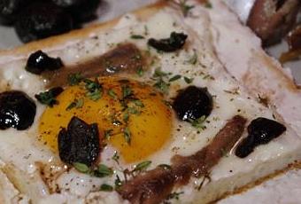 J'arrive!!! je te fais toaster une tranche de pain de mie, je la tartine de ricotta, et ajoute un oeuf au plat carré avec des anchois, des olives noires et du thym