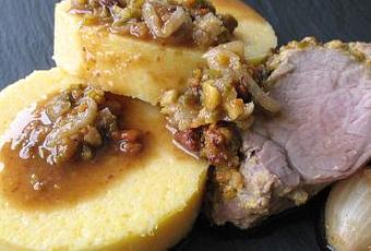 Pour 6 personnes : 1 gros filet mignon, 1/2 sachet de pistaches non salées, 3 échalotes, 1 càs bombée de miel (lavande pour moi), 1 càs bombée de moutarde (au miel et au vinaigre balsamique pour moi...merci Thierry, ça doit être sympa avec de la Savora), sel, poivre et de la polenta pour accompagner.