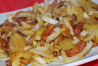réchauffer le contenu de la poêle et y ajouter 6 c à s de vinaigre, verser alors les lardons sur les p de terre et mélanger