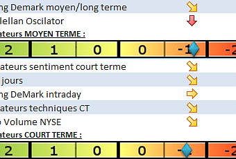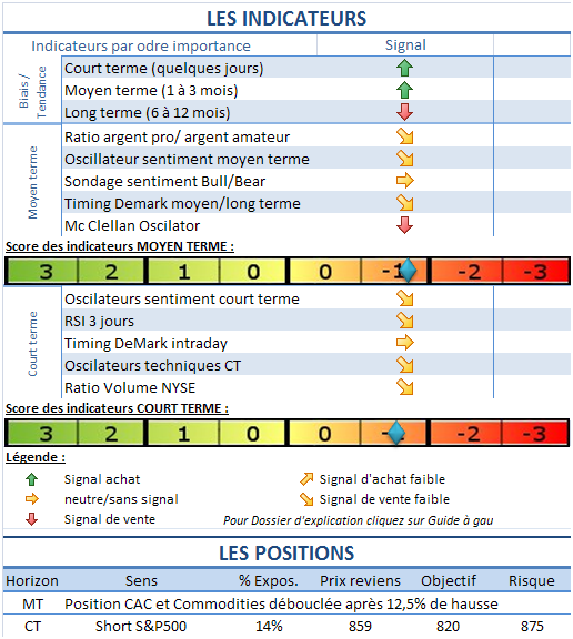 Comme nous indiquions Jeudi nous avons shorter le S&P500 sur 859. Nous avons pris 1/3 des bénéfices ce matin (d'où l'exposition de 14% dans le tableau ci-dessus) sur 845 et nous conservons la position jusqu'à la zone C5/C6. Le dépassement de C7 devrait permettre une extension haussière mais nous ne pensons pas que 875 pourra être franchis. Si nos signaux baissiers moyen terme se renforce vers ces niveaux, nous n'hésiterions pas à prendre un exposition baissière à moyen terme.