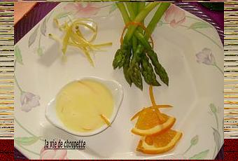Dans une autre casserole, faites réduire 1/4 de litre d'eau de cuisson des asperges jusqu'à l'obtention de 4 c à s de jus. Ajoutez-y la réduction de jus d'orange et de citron. Portez l'ensemble à ébullition et, en fouettant, incorporez le beurre en parcelles sans faire bouillir. Emulsionnez la sauce au mixeur à main et incorporez-y les juliennes de zestes de citron et d'orange.