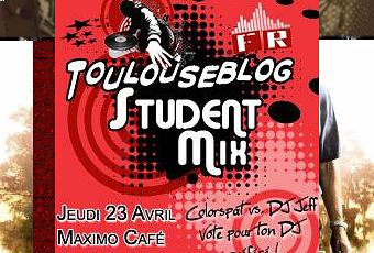 Après 5 mois de compétition, l’heure de la finale du Toulouseblog Student Mix est arrivée. Celle-ci opposera Jeff, le représentant de Pharma, à Colorspat, les Dj’s de l’IUT Paul Sabatier, le Jeudi 23 Avril au Maximo Café pour une soirée qui s’annonce riche en émotion. Mais la finale commence dès aujourd’hui car vous pouvez voter en ligne pour soutenir votre DJ favori. Le Toulouseblog Student Mix, c'est 8 écoles et universités toulousaines qui s'affrontent au cours de 7 soirées au Maximo Café depuis le 4 Décembre 2008. Le But ? Trouver le meilleur DJ étudiant toulousain et faire la fête tout au long de l'année.Ce Jeudi 23 Avril, le Maximo Café sera le théâtre de la finale du Toulouseblog Student Mix qui opposera donc Jeff et Colorspat. Ces deniers réaliseront des prouesses aux platines et comptent sur le soutien de toute leur école pour remporter cette 1ère édition de l’événement. L'ambiance s'annonce très chaude pendant toute la soirée et notamment pendant les sets des DJ’s qui pourront à coup sûr compter sur la forte mobilisation des camarades de leur école. Pour cette finale, de nombreux cadeaux seront à gagner dont un voyage à Port Aventura, des téléphones portables, des places pour TFC-Lorient....