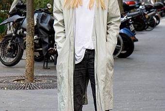 Daul a un look décontracté absolument parfait: un tshirt de pyjama sur lequel est négligemment posé un imperméable de la créatrice Ann-Sofie Back. Les bottines de style militaire pour arpenter le bitume parisien sont bien sûr gardées ouvertes.
