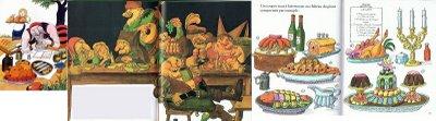 Le texte est d'une saveur des plus remarquables: entre la description de l'ogre, à faire frémir même les plus courageux, et la liste des mets préparés par Zéralda, on nage en plein bonheur. Les illustrations sont très bien réussies et ont le raffinement d'expliciter et/ou d'apporter au texte une dimension parfois très inquiétante! La dernière, surtout, est en adéquation avec l'insolite du texte "Puis les années passèrent. Zéralda devint une belle jeune fille, l'ogre, toujours bien nourri, rasa sa barbe piquante, et ils devinrent amoureux l'un de l'autre. Ils se marièrent, menèrent une vie agréable et eurent un grand nombre d'enfants. On peut donc penser que leur vie fut heureuse jusqu'au bout."
