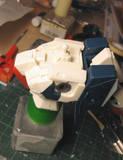 Le buste est entièrement tigé et collé à la cyano. IL a fallu modifier les 2 pièces bleues afin qu’elles s’adaptent parfaitement au reste du buste. Le packpack que l’on voit sur ces photos n’est pas la version complète de ce dernier.