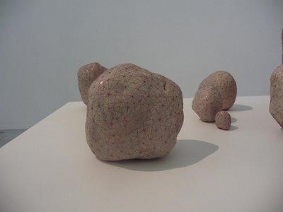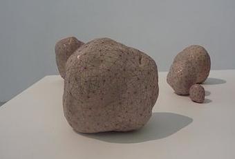 De comment certaines œuvres se dégagent et s’imposent avec une beauté simple et évidente.Sans nécessairement s’en expliquer, quelques œuvres émergent de la profusion visuelle pour imposer, entêtantes, un charme singulier un peu énigmatique. Et si les choses se dissolvent communément dans l’ordinaire tumulte du monde, celles-ci répondant semble-t-il à quelque mouvement plus ample imposent une sorte de décélération, une attention spéciale, comme un souffle profond. Elles s’imposent à notre carte sensible ou au musée imaginaire que chacun porte en soi comme des points ou des stèles déployant l’étendue, comme les instants prégnants soutenant notre parcours. Que dire de quelques objets antiques et beaux, de quelques masques terribles, de tableaux superbes ou d’autres monuments sinon qu’ils accompagnent en frères l’humanité collectivement et individuellement ? Moi j’ai marché très vite après quelques galeries pendant un court temps libre, j’ai oublié des choses à peine vues et puis cet après midi j’en ai transporté une d’une rue à l’autre sans même le vouloir. On n’a pas décision de ce qui s’imprime en vous. La fascination qu’exerce l’œuvre « the river at night » de Lionel Estève visible en ce moment dans l’espace Saint-Claude de la galerie Perrotin* pourrait tenir à sa délicatesse, son évidence simple, à son essentielle étrangeté, à son calme apaisant ou à la conjugaison étonnante des pierres érodée et du maillage de fil qui dessine sur leur relief une constellation fine, à la résistance enfin à toute interprétation définitive de l’image qu’elle propose. A l’image des rapprochements surréalistes de Breton, de Soupault, de Lautréamont ou de Roussel, l’œuvre semble tirer sa poésie vertigineuse de l’écart irrésolu qu’elle porte en elle et qui fonctionne comme un trou noir aspirant en lui des galaxies entières, l’image d’une rivière roulant et façonnant les roches, intimité et grands espaces, les contractions et les élans : toute une métaphysique. On pense à des planètes, à tout un ordre immense, à la vie naturelle des choses. Pourrait-on dire alors qu’à l’image du monde ce qui fascine en cette oeuvre est son irréductible opacité, sa vivacité calme ? A y regarder encore et plus généralement, les œuvres de Lionel Estève, celles que nous pouvons voir dans l’expositions et celles que nous connaissons par ailleurs, appellent et entreprennent l’espace, objet éminemment impalpable et spirituel, un peu comme le cinéma fabrique une fiction du monde qui nous pense et nous accompagne.