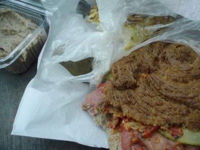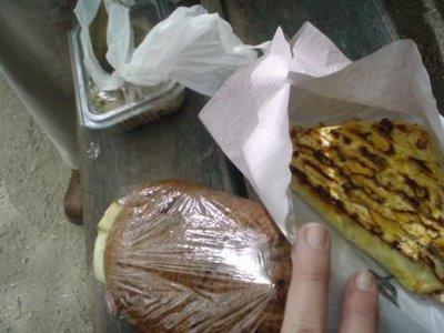Pain non levé de farine de maïs (et peut-être de farine de matza) avec du pastrami, du caviar d’aubergine mangé avec un bout de sandwich, un friand au fromage avec des matsot.