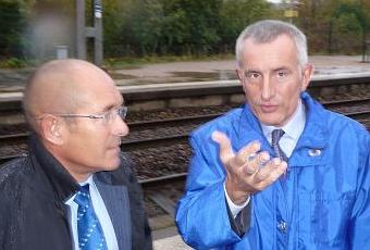 Alain Le Vern, président de la Région et Guillaume Pépy, président de la SNCF, lors d'une visite à Val-de-Reuil. (photo JCH)« S'il faut faire 40 passages à niveau, supérieurs ou inférieurs, alors il est clair que cette ligne ne pourra pas être financée. » Quelques minutes avant de prononcer cette phrase le 7 avril dernier lors d'une conférence de presse, Alain Le Vern, président de la Région Haute-Normandie, a assuré que les études concernant l'evntuelle réouverture de la Ligne SNCF Evreux-Louviers-Rouen ont conclu à la faisabilité économique, reste à attendre les études techniques. Ne nous leurrons pas. La réouverture de cette ligne n'est plus une priorité régionale. Alain Le Vern a reculé en bon ordre c'est-à-dire en disant sans le dire que le coût de la réouverture sera astronomique pour la Région et que les priorités de la majorité actuelle ne pourraient plus être assurées.