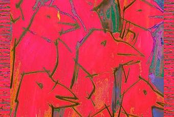 Dans la série: Mon appareil photo exagère plus que moi, voici La Foule de Corbeaux, 2.Peinture acrylique, craie, crayon de couleur sur papier à dessin, photo-image numérique, détail.
