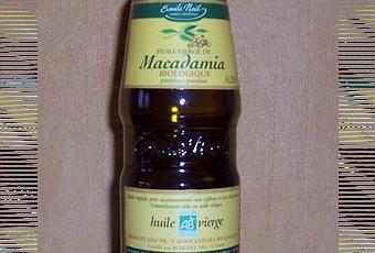 L'huilerie m'a fait parvenir cette bouteille d'huile vierge de noix de macadamia biologique :