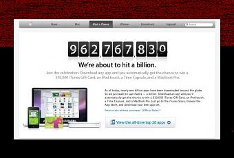 As of today, nearly one billion apps have been downloaded around the globe. So we just want to say thanks — a billion. Download an app and you’ll automatically get the chance to win a $10,000 iTunes Gift Card, an iPod touch, a Time Capsule, and a MacBook Pro. Just go to the iTunes Store, browse the App Store, and download your best app yet.