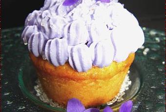 Mélanger la farine, le sucre à la violette et la levure et ajouter à la préparation liquide