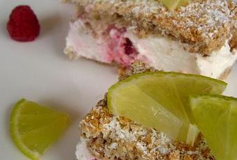 Cover evenly with the 3/4 of the lime mousse. Arrange raspberries into the cream. Cover with the reamining cream then with the second dacquoise layer. Press gently. Brush this layer with syrup too. .