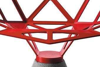 Des lames d’aluminium reliées entre elles, tressant la structure 3D géométrique de la One Chair constituent cette assise unique imaginée par Konstantin Grcic pour Magis en 2004. Le modèle Concrete Base, modèle à pietement en pierre massif est particulièrement remarquable, un mélange brut métallique et minéral et pourtant contrasté entre une structure treillis fine, aérée et une base massive et lourde. La chaise a été déclinée en tabouret de bar, chaise à pied, chaise de bureau avec roulettes.