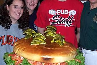Le restaurant Clearfield de Pensilvania, considère qu'il a créé le Hamburger plus grand que le monde. Au moins ils ont de grands motifs pour cela. Avec un poids de 123 livres (55.90 Kilos), ce hamburger énorme a 80 livres de viande, un pain de 30 livres, 12 tomates et 160 rondelles de fromage. Il porte additionnellement une livre laitue, d'un de ketchup, d'une de moutarde, d'une de mayonnaise et de cinq oignons. Le prix du Hamburger est d'U$ 379. Le restaurant projette d'envoyer les documents qui créditent la création de ce Hamburger énorme au livre de Guinness World Enregistrements, cette semaine.