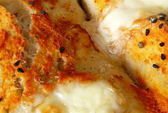 5- Badigeonnez d’un peu d’huile d’olive. Saupoudrez de ciboulettes. Etalez la crème de poivron sur toute la surface en fine couche. Déposez les billes de mozzarella un peu partout sur la pâte en les enfonçant. Terminez par le nigelle.