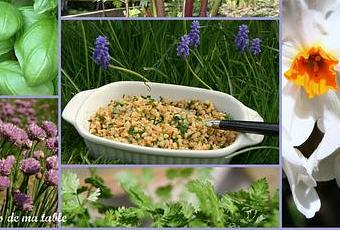 Des graines de petit épeautre cuites que vous pouvez remplacer par des grains de blé (Ebly) si vous ne trouvez pas les premières. Variez les herbes du jardin mais n'oubliez pas que certaines ont une saveur plus prononcée que d'autres. Veillez donc à doser subtilement chaque herbe.