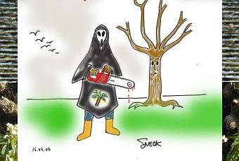 "A la mode nazairienne, les arbres tombent à la pelle et à la benne et pas forcément parce qu'ils sont malades, non non c'est pour la vue de certains, pour le côté pratique, pour pas s'emmerder etc , pour la peine (au propre et au figuré) on a droit à la réponse toute faite des responsables de la chôse : "des arbres? mais y'en a jamais eu autant"- c'est sur que si on appelle "arbre" des pousses de 43 centimètres on en a jamais autant vu- et puis côté diversité on repassera- la mode est au palmier- on se la joue station balnéaire sans doutes, dommage que l'on ne puisse pas s'y baigner sur sa principale plage..." -merci à rémy pour le dessin et à philippe pour la photo-