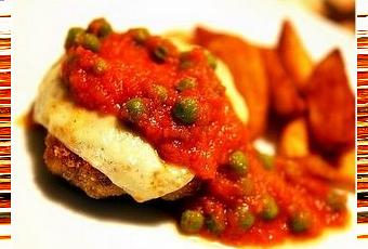 Retirer les galettes du four et les transférer dans un plat de service. Napper avec la sauce aux tomates et aux petits pois. Servir sans attendre, avec des frites.