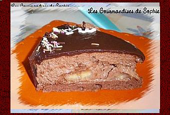 J'ai réalisé un biscuit joconde chocolat, un bavarois chocolat, avec des bananes caramélisées et flambées, et enfin un glaçage brillant au chocolat. Entouré de carrés de chocolat, cet entremet nous a vraiment séduit (n'est pas Arnaud ?!).
