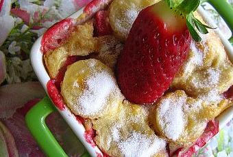 La belle saison est de retour.......avec en primeur....les fraises..quoique pas encore très bonnes pour être mangées ainsi (j'en connais l'explication...mais trop long pour expliquer....alors allez voir sur le blog d'Anne et José http://lesjardinsdepomone.skynetblogs.be/tag/1/FraisesMais pour ce clafoutis, elles sont moyennement bonnes!Pour votre marché:-2 bananes-400 gr de fraises-3 oeufs-125 gr de farine-80 gr de sucre semoule-1 càs d'alcool de framboises-15 cl de lait-6 cl de crème fraîche-le jus d'un citron-1 sachet de sucre vanillé-sucre glace pour le décorJe fais comment?*Je lave mes fraises et je les équeute*Les couper en petits morceaux*Peler et couper les bananes en rondelles et arroser de jus de citron.*Préchauffer votre four à 180°CPour la pâte:*Battre les oeufs entiers avec les sucres.*Ajouter la farine, le lait, la crème.*Bien mélanger.* Ajouter l'alcool de framboises*Beurrer des ramequins individuels.*Y déposer les fruits dans le fond.*Verser la pâte dessus.*Cuire 30 à 35 minutes.*Avant de servir, saupoudrer de sucre glaceJe dois avouer que le mélange fraises-bananes est assez surprenant et très frais!
