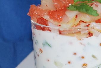 mettre la préparation dans deux petites verrines, et ajouter sur le dessus le poisson et les morceaux de pamplemousse
