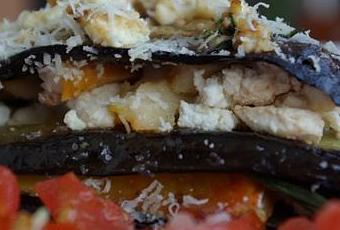 montez en couches l'aubergine puis de la brousse avec du haddock et des feuilles de menthe fraiches, etc