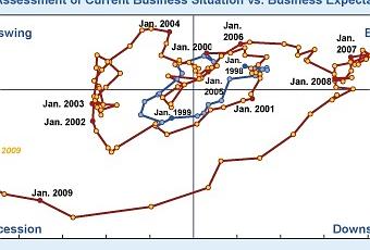 inflexion s'est réalisée particulièrement en ce qui concerne les anticipations à 6 mois. L'indicateur s'oriente vers la case "croissance" mais reste encore extrêmement enfoncé en position
