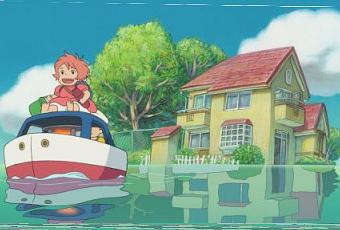 Miyazaki s'est toujours plu à animer les éléments. Vent, terre, feu et eau. L'eau surtout qu'il est capable de représenter avec une pureté sans égale. De ce point de vue, Ponyo est un impressionnant festival dont l'eau est le motif central. Elle prend toutes les formes, toutes les couleurs. Tour à tout nappe sombre aux yeux inquiétants, vaste agglomérat de poissons qui se fondent les uns aux autres, larges étendues translucides révélant les paysages engloutis, divinité au visage féminin sublime et aux cheveux ondulants, simple jet, celui que Ponyo crache, espiègle, celui de la pompe qui permet à Sôsuke de la sauver une première fois.