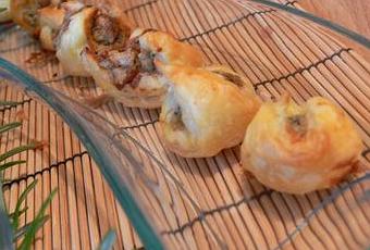 Etalez la pâte feuilletée, coupez des bandes de 6 cm environ, dans ces bandes couper la pâte en plusieurs petits triangles, déposez des boulettes de pâte au milieu des triangles, mouillez les côtés avec un peu d'eau et repliez chaque coin sur le milieu.
