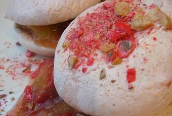 Dans chaque assiette présentez 2 meringues garnies de compote , saupoudrez de pralines restantes .