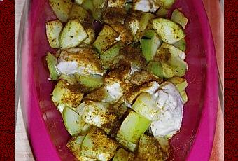 Détailler le poulet et la courgette en dés, ajouter les épices et mélanger.