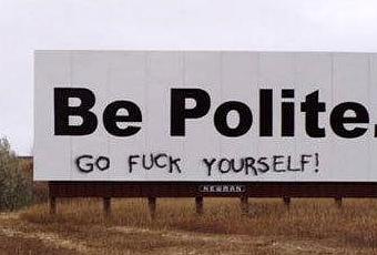 [1] En gros sur l'affiche : "Soyez poli". Et en ajouté en dessous : "Va te faire foutre !"