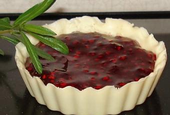 Pour 4 tartelettes : 100gr de chocolat blanc, (pour des moules silicones de 7cm de diamètre), 40gr de galette style St Michel bien écraser, 100gr de framboises, 100gr de sucre 1 branche de thym frais. Faire fondre le chocolat blanc avec 1CàC d'huile neutre au micro onde 1mn à 450watt, bien mélanger et déposer dans vos moules avec l'aide d'un pinceau, laisser prendre au freezer et répéter l'opération 2fois pour que les tartelettes soit suffisamment solides, la deuxième fois déposer dans le fond ses tartelettes 1CàS de galettes écrasé , ensuite démouler vos tartelettes (quand le chocolat à bien pris) et réserver au frigo. Faire cuire dans une casserole à feu doux le sucre et les framboises 10mn et ajouter la branche de thym frais en fin de cuisson, retirer du feu et laisser refroidir, retirer la branche de thym frais et déposer cette confiture de framboise dans vos tartelettes (2CàC environ par tartelettes) et bon appétit.