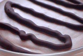 A l'aide d'une pipette, dessinez des serpentins sur la mouse au chocolat au lait. Vous pouvez aussi recouvrir entièrement la surface, en couche fine, mais toujours à l'aide d'une pipette ou poche à douille car la chantilly n'aime pas le chaud, et fond si on étale le chocolat à la spatule.