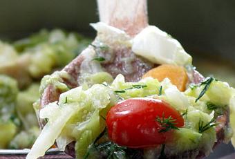 Laver le chou et enlever, si nécessaire, les deux premières feuilles. Emincer finement le chou et le mettre, en 2 -3 fois, dans la casserole avec la viande. Au bout de 10 minutes, y ajouter les tomates coupées en deux ainsi que l’aneth ciselé. Assaisonner avec le sel et le poivre et poursuive encore un peu la cuisson. Le chou doit être tendre.