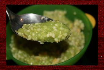Troisième idée, toujours basée sur le même constat (morceaux de féculents + purée de légume = miam miam) avec cette fois ci 3 ou 4 fleurettes de brocolis cuites et mixées avec un peu d'eau de cuisson (pour obtenir une purée bien lisse et liquide), et 2 cuillères à soupe de boulghour.