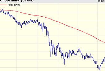 La ligne rouge du graphique est la courbe de la moyenne mobile de 200 jours de l’indice. Cette courbe indique la tendance de l’indice. Bien que l’on constate que la hausse a permis à l’indice de se rapprocher de sa ligne de tendance, on ne peut ignorer que celle-ci continue de pointer vers le bas.
