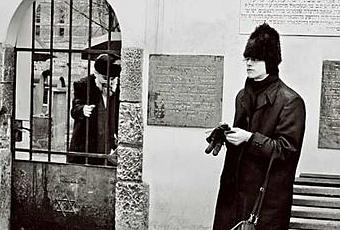 Photo prise sur le vif montrant deux rabbins orthodoxes (probablement d'origines Russes) au vieux cimetière Juif de Cracovie (Krakow) en Pologne. Ils étaient une vingtaine à y faire un pèlerinage. Quelques secondes avant la prise de vue, ce jeune homme sifflait en faisant de grands gestes à travers la grille pour faire signe à d'autres jeunes rabbins de se dépêcher de revenir...
