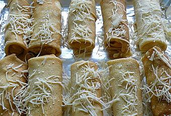 Déposez les crêpes sur une plaque allant au four, parsemez-les de râpé et faites chauffer une 15 de minutes dans un four préchauffé à 210°C (th7).