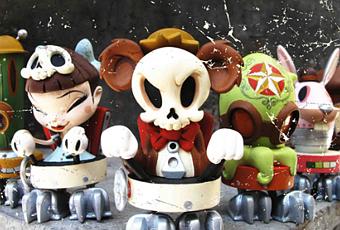 L’ami de Kathie Olivas (je ne connais pas la situation maritale exacte, je ne veux pas m’attirer d’embrouilles) qui a déja offert au peuple le sympathique duo Slap Happy & Mr Muggles sort tout son attirail pour une dizaine de mini figurines léchées, et en plus une figurine rare par Kathie. Un mélange de robots dingos sur pattes, de lapins-méchas, de petites filles souriantes, de bestioles crâneuses avec un mécanisme sur le coté et j’ignore encore si celui-ci fonctionne (je pense pas j’aime bien juste semer le doute). Toujours est-il que sur les images qui ont filtré on peut voir que l’on a encore pas déconné avec le QC (Quality Control). Les boîtes sont annoncées comme très réussies, à l’image des autres mini séries que Mindstyle produit.