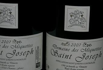 Ultime rencontre faite au salon Bio-Eco de Besançon, Paul Estève, du domaine des Miquettes, chaudement recommandé par un jardinier d'Eva à l'affût des belles découvertes. Une dégustation trop rapide, faute de temps, mais une très bonne approche et une excellente accroche, avec le vigneron, la vigneronne et les vins. Tout d'abord un fort joli Viognier d'Ardèche 2007, frais et fruité, évitant le caractère fréquemment mou et pataud inhérent au cépage, et puis surtout, regoûtés tout dernièrement à la maison, une belle paire de Miquettes, un Saint-Jo blanc et un Saint-Jo rouge, millésime 2007 itou. Un blanc d'une fraicheur absolue, sans une once de lourdeur ni de sensation alcooleuse, une Marsanne vinifiée sur le fil, avec beaucoup de tension, et puis un rouge, mamma mia, un rouge comme rarement! De la syrah de compétition, au grain serré mais soyeux, à la matière fraiche et acidulée, aux notes délicatement fumées. Un vin qui vous donne la chair de poule comme ça, ça me ficherait presque les miquettes. Oxymore plutôt rassurant, finalement!