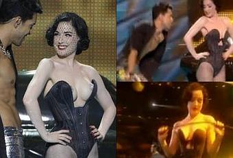 Cette derniere s'en est offusqué sur son twitter, en parlant de nipplegate ( clin d'oeil a l'affaire du sein de janet jackson au super-bowl).Au final, les allemands n'auront pas eu le plaisir d'égayer la soirée de l'Eurovision comme ils le voulaient et leur petite mise en scène a fait un flop. C'est finalement avec un corset correctement attaché (on voit sur la photo un morceau de tissu noir rajouté pour tenir le décolleté) que Dita Von Teese a passée les 3/4 de sa prestation, oubliée par les caméras. On est pas là pour rire à l'Eurovision, que ca se sache. C'est vraiment dommage que notre ami Alex Swing, qui n'est autre que Alex C un Dj de dance ultra putassiere, ne soit pas allé a l'eurovision avec son merveilleux et puissant titre : "Du Bist So Porno", pas besoin de traduction...ca c'est l'allemagne !