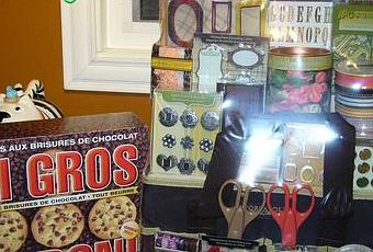 Voici ce que j'ai reçu de ma sista lors de son retour de voyage... Mes biscuits préférés aux pépites de chocolat!!! Et un méga kit découverte pour faire du Scrap! Il contient: un sac de transport, des ciseaux, rubans, boutons, étampes, album, papiers, autocollants, etc. Je commence à être de plus en plus vendue à ce magnifique passe-temps!!! Voilà... je m'empresse d'ouvrir tout ça!!!